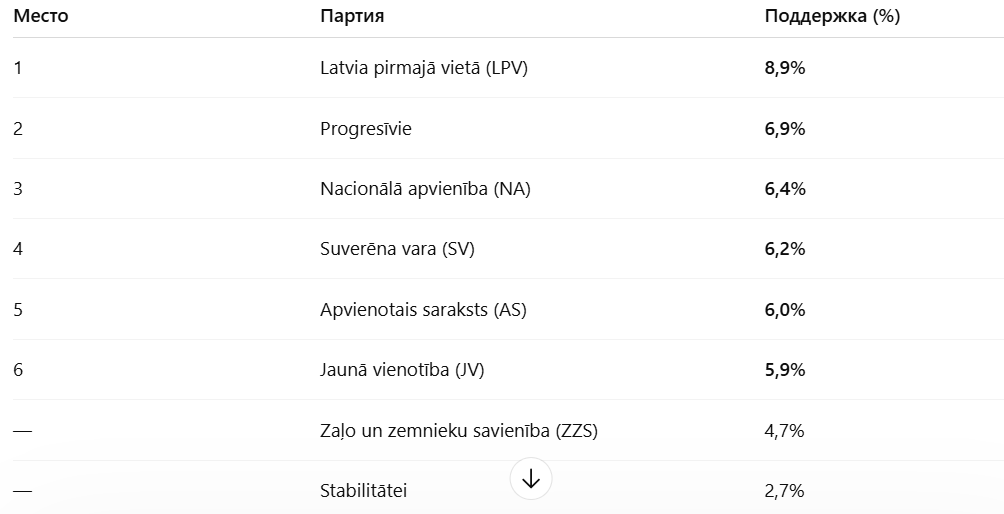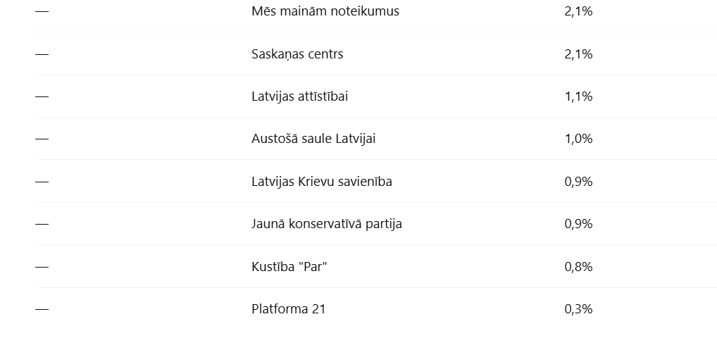 Среди партий правящей коалиции наилучший результат показали «Progresīvie», занявшие второе место с поддержкой 6,9% избирателей и опередив партию премьер-министра «Jaunā vienotība» (JV). На третьем месте расположилась «Nacionālā apvienība» (NA), которую готовы поддержать 6,4% граждан.