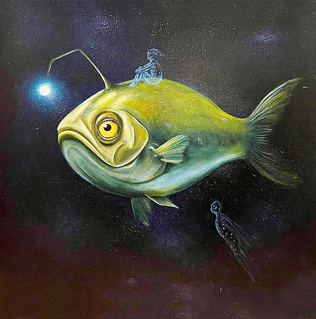 Мне нравятся глубоководные рыбы, которые как божественные амфибии несут маленького человека сквозь темные воды — куда-то к Свету. Смотрю на эти картины и понимаю, что мир еще дышит разумом, еще не захлебнулся в гное войн и национальных распрей. Есть вот такие странные рыбы и они буквально уводят все живое подальше от беды.