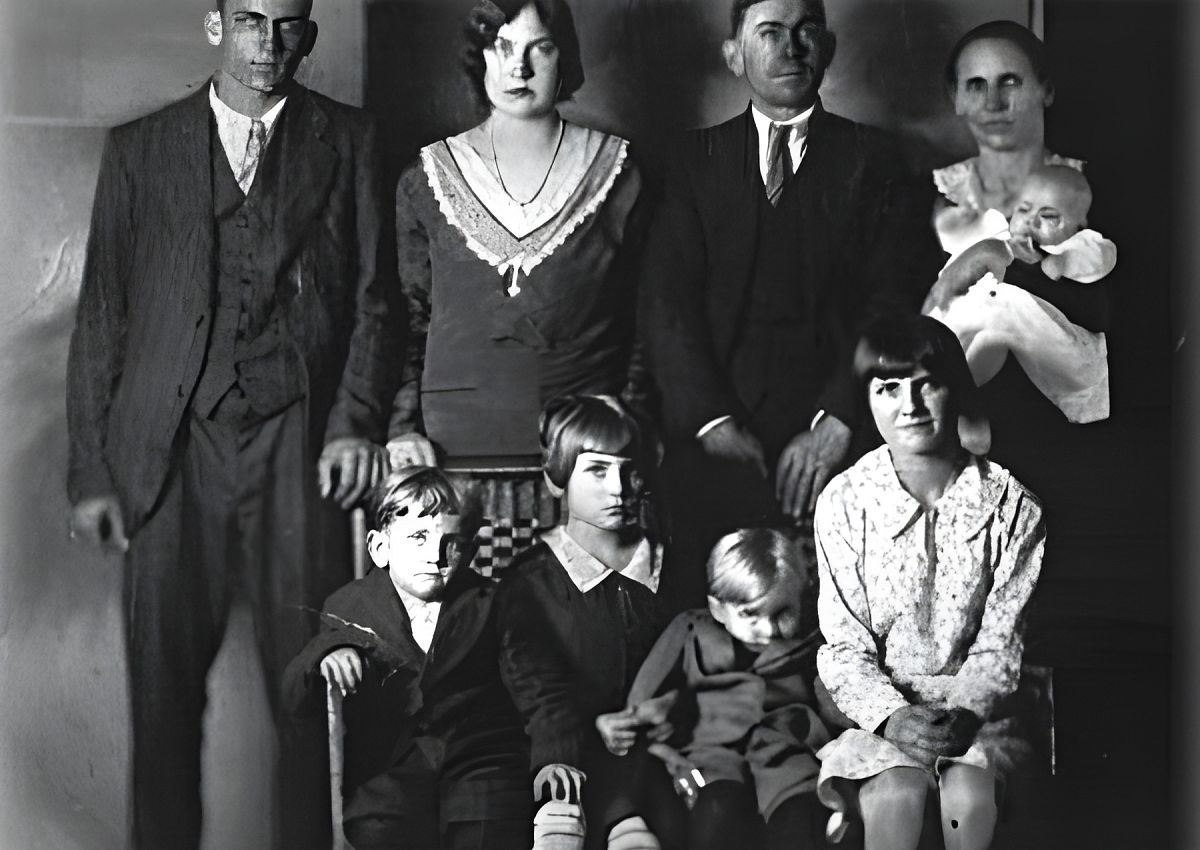 На фотографии его 37-летняя жена Фанни стоит рядом с мужем, прижимая к себе трехмесячную Мэри Лу. Старшие дети — 17-летняя Мари и 16-летний Артур — держатся прямо, почти по-взрослому. В первом ряду сидят младшие: четырехлетний Джеймс, семилетняя Мейбелл, двухлетний Реймонд и 12-летняя Кэрри. Мужчины в костюмах и галстуках, женщины в платьях. Все, кроме младенца, смотрят прямо в объектив — спокойно, сосредоточенно, без улыбок.