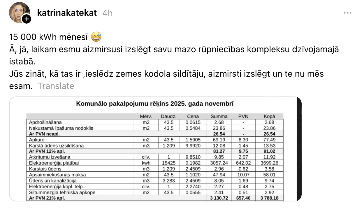 «15 000 кВт·ч в месяц. Ах да, наверное, забыла выключить свой маленький промышленный комплекс в гостиной. Знаете, как это бывает: включила гелиотермальный обогреватель, забыла выключить, и вот вам», — пишет Катрина на сайте «Threads». И иронично замечает, что, вероятно, получила счёт за освещение фестиваля света «Staro Rīga».