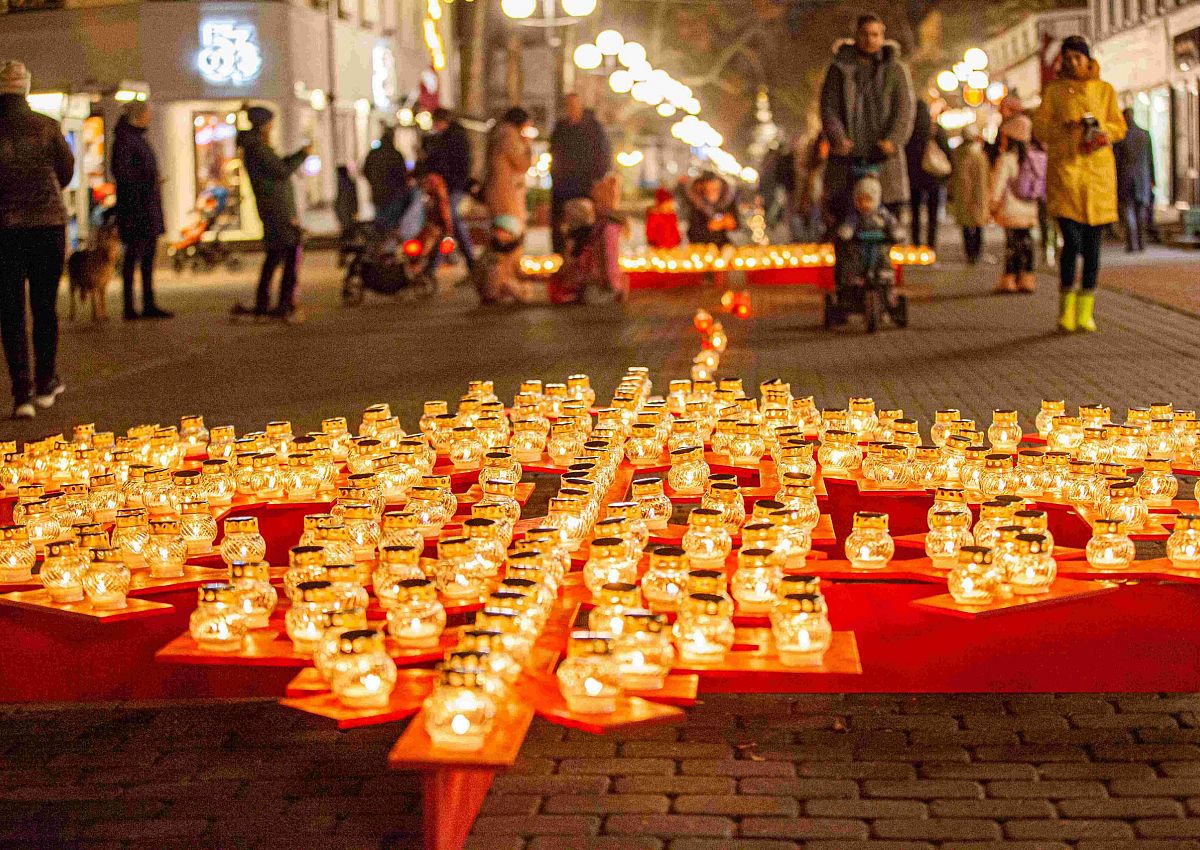 Особую атмосферу создадут огненные узоры на улице Йомас. Здесь из свечей выложат символы Солнца, Аусеклиса и Дерева Аустры, а к участию особенно приглашают семьи с детьми. В 16:00 у дома Аспазии на проспекте З. Мейеровица пройдёт совместное пение под названием «Латвия янтарная жемчужина моря» вместе с этномузыкантом Лаумой Бэрзу.