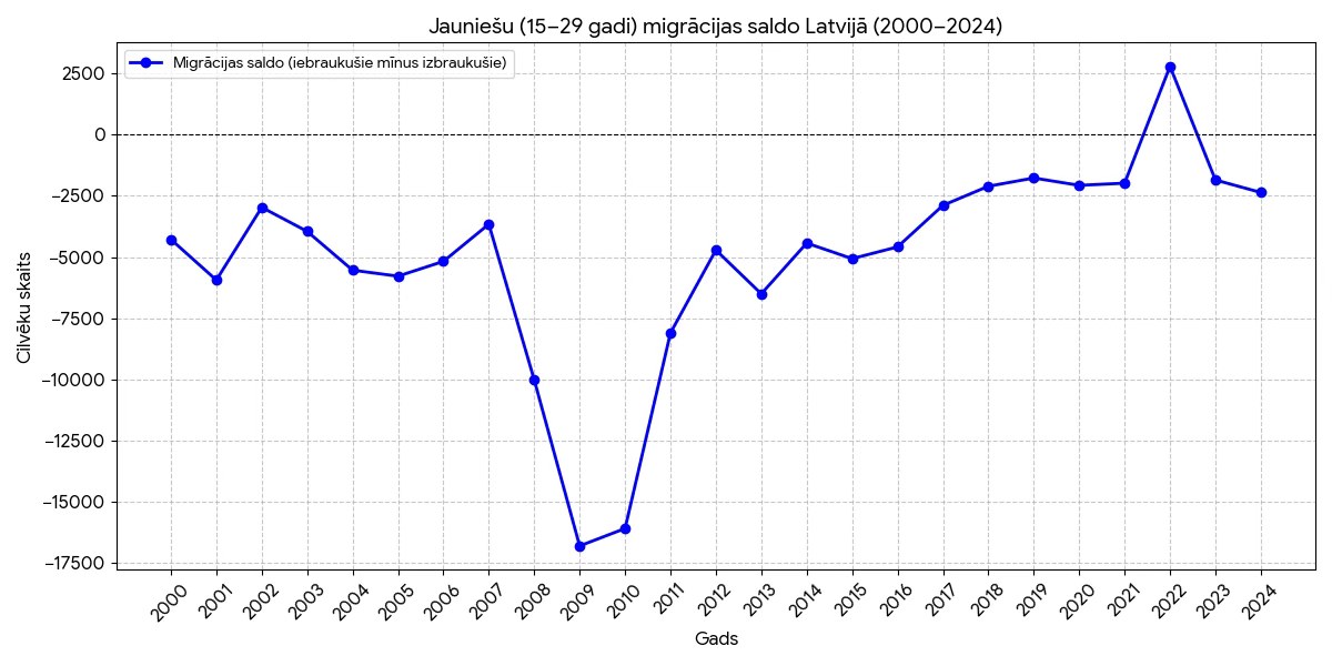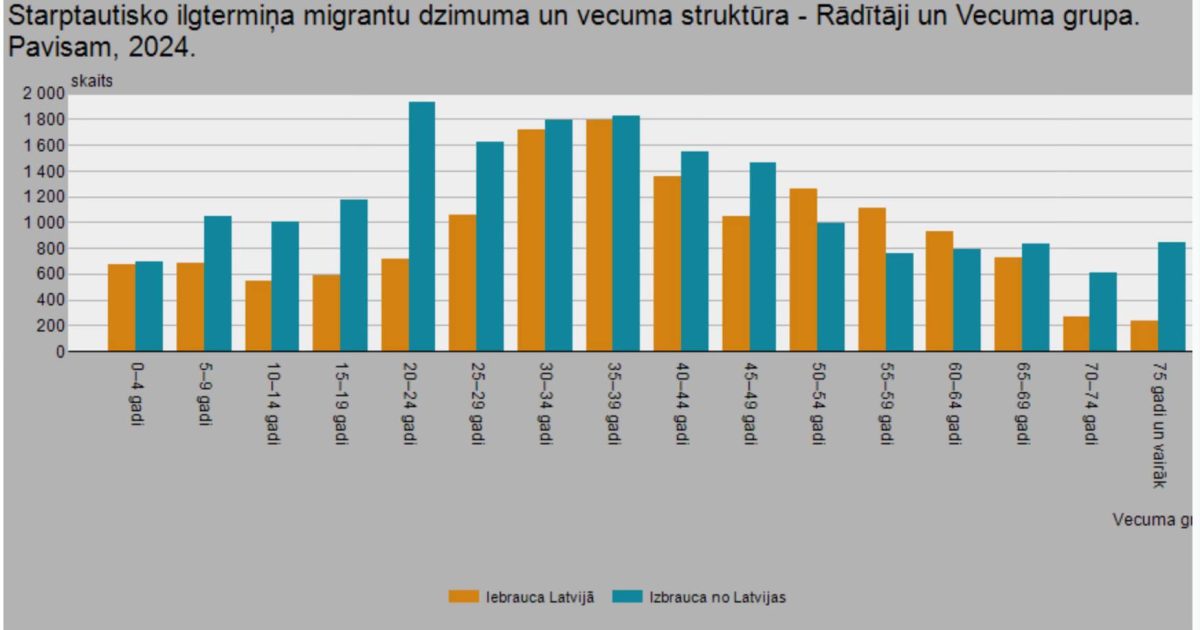Первый график: данные по уехавшим и приехавшим в Латвию по возрастным группам за 2024 год; в другие годы — примерно та же картина (источник — CSP).