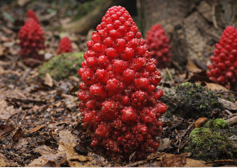 Речь о Balanophora. У неё нет корней, листьев и даже хлорофилла. Она не умеет фотосинтезировать и живёт как настоящий паразит — цепляется к корням строго определённых деревьев и буквально высасывает из них питательные вещества.