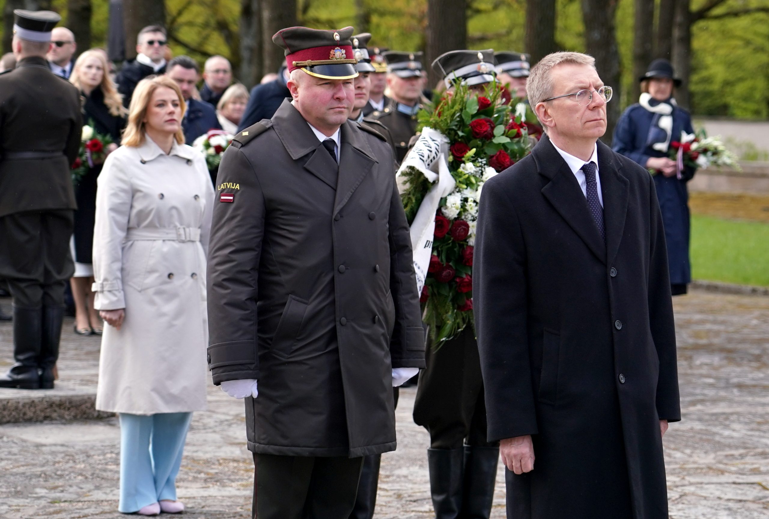 Президент Эдгар Ринкевич, премьер-министр Эвика Силиня (Новое единство) и спикер Сейма Дайга Миериня (СЗК) приняли участие в торжественной церемонии возложения венков на Рижском братском кладбище около 9 утра.