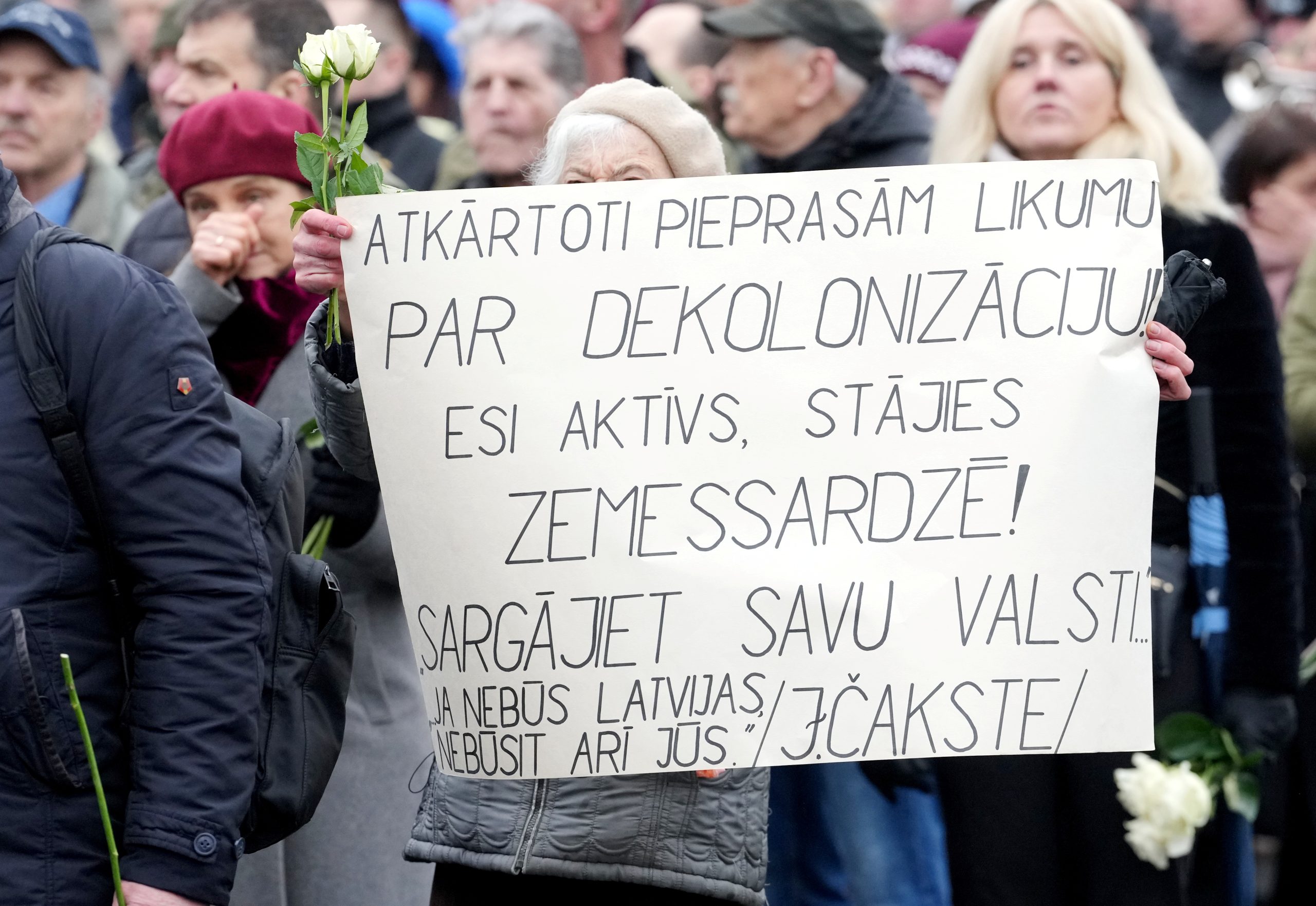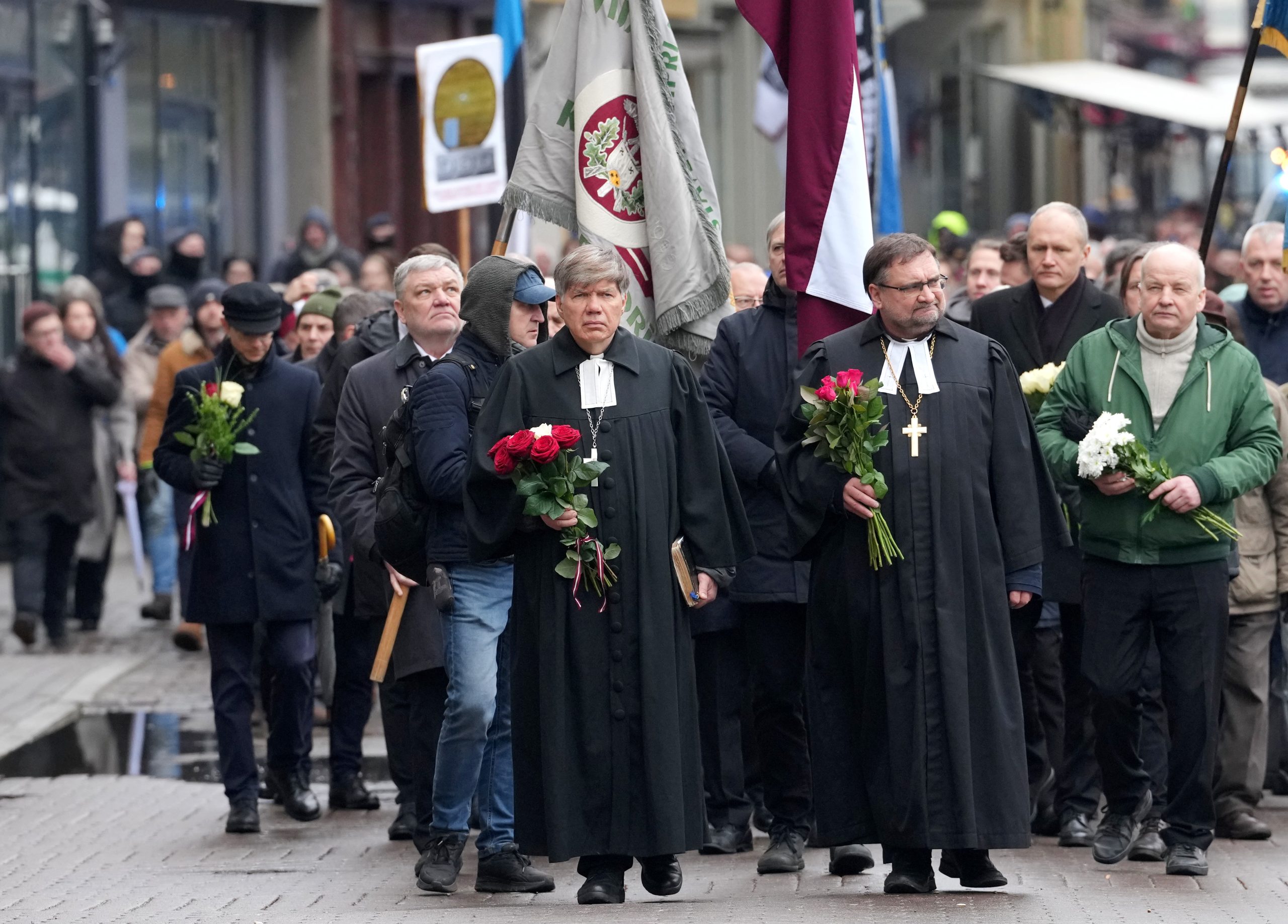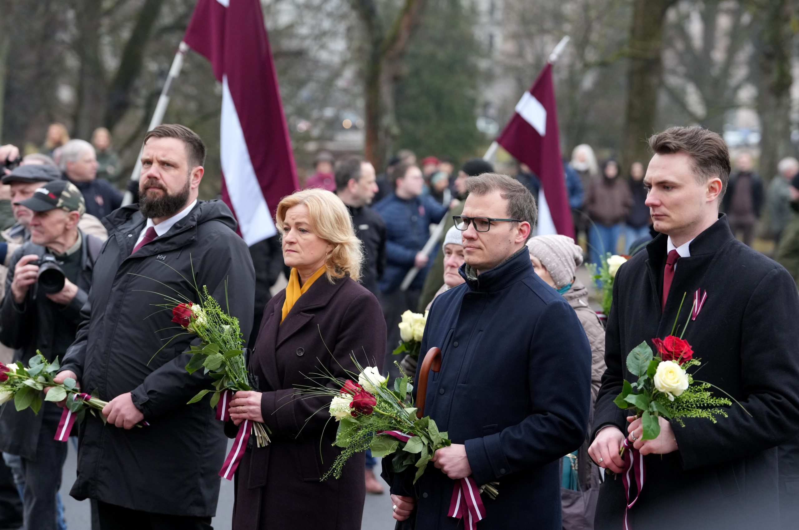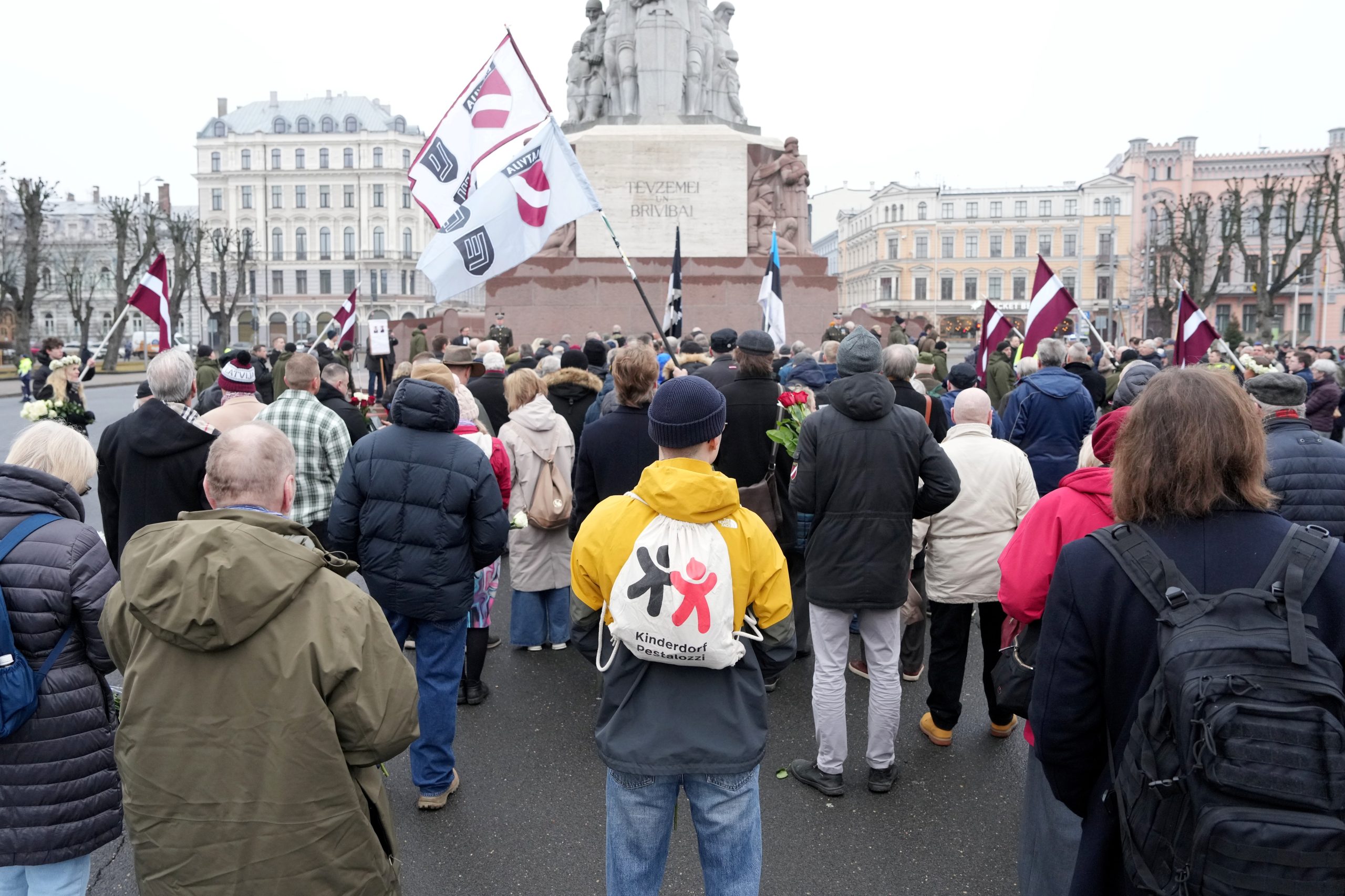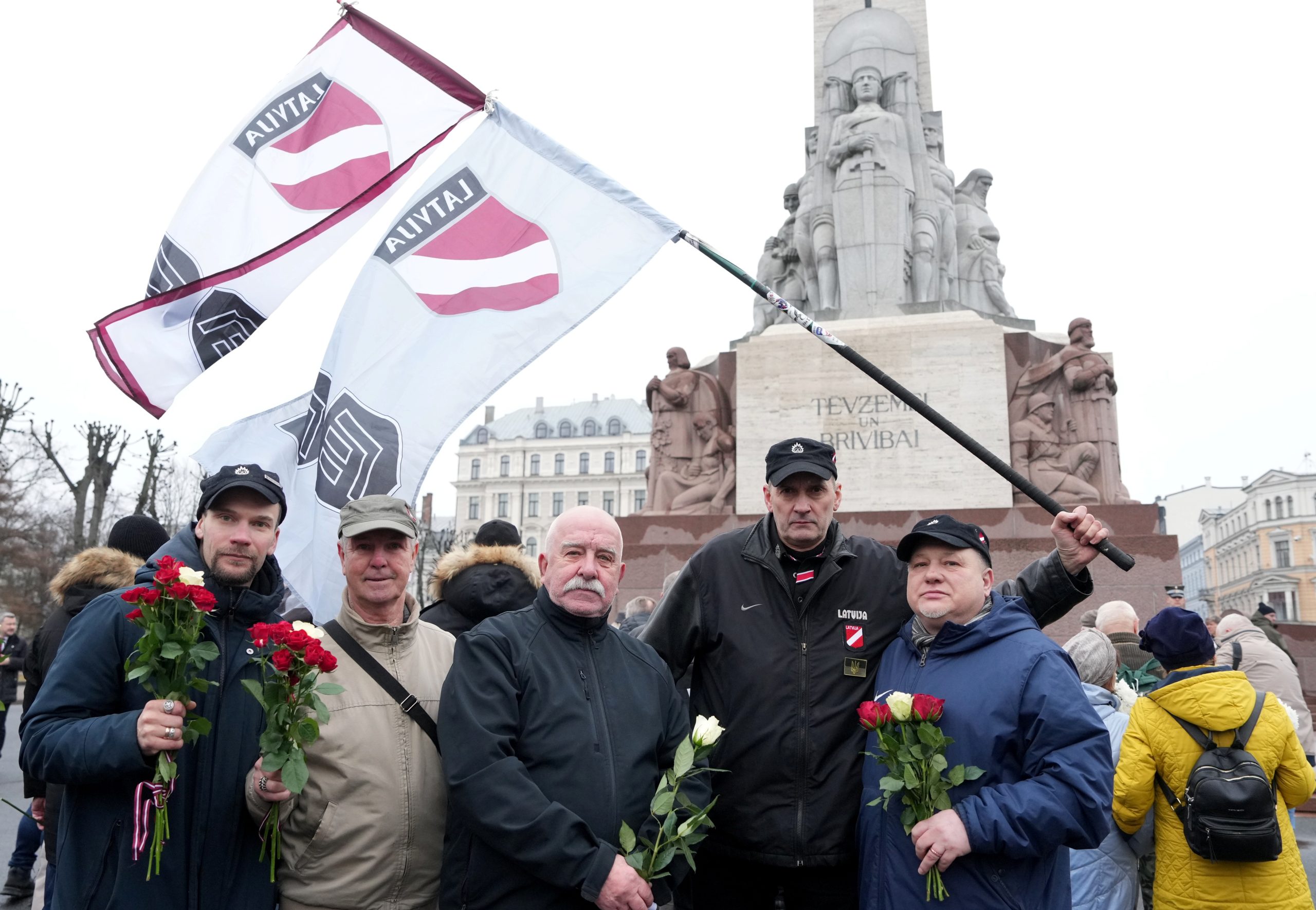 Участники шествия пели песни, некоторые несли флаги Латвии и Эстонии. У памятника их встречала аллея из латвийских флагов, созданная людьми.