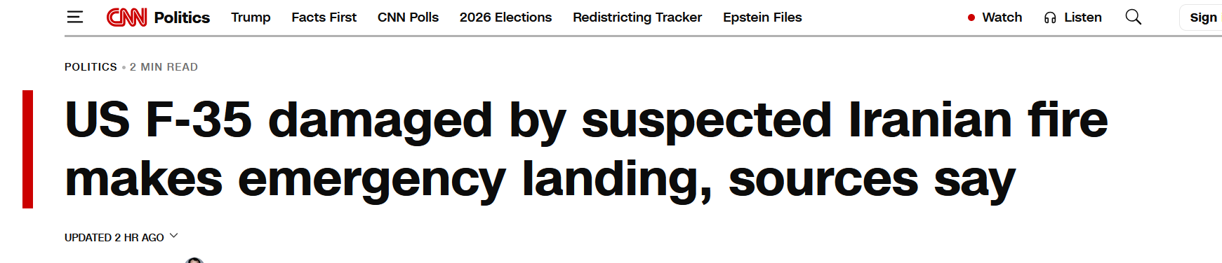 Это первый эпизод, когда Иран смог поразить американский самолет в рамках конфликта, начавшегося в конце февраля. Корпус стражей исламской революции Ирана подтверждает, что в четверг подбил самолет. «Истребитель F-35 американской армии был подбит в 02:50 сегодня утром новым передовым комплексом ПВО аэрокосмических сил КСИР и получил серьезные повреждения», — говорится в заявлении КСИР иранскому агентству Fars.
