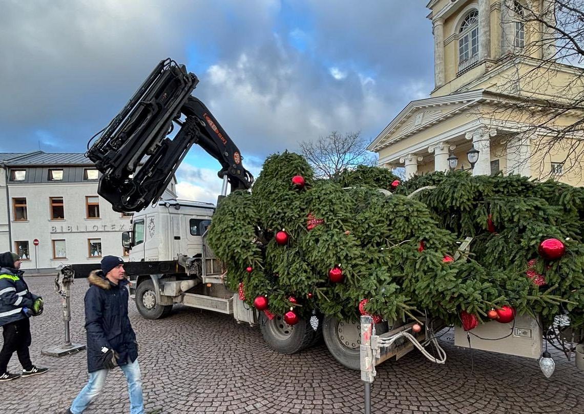 На Ратушной площади сильный ветер повалил главную праздничную елку. Специалисты пришли к выводу, что ветер приподнял елку в воздух и повалил. Подставка не сломалась, но была вырвана вместе с крышкой люка.