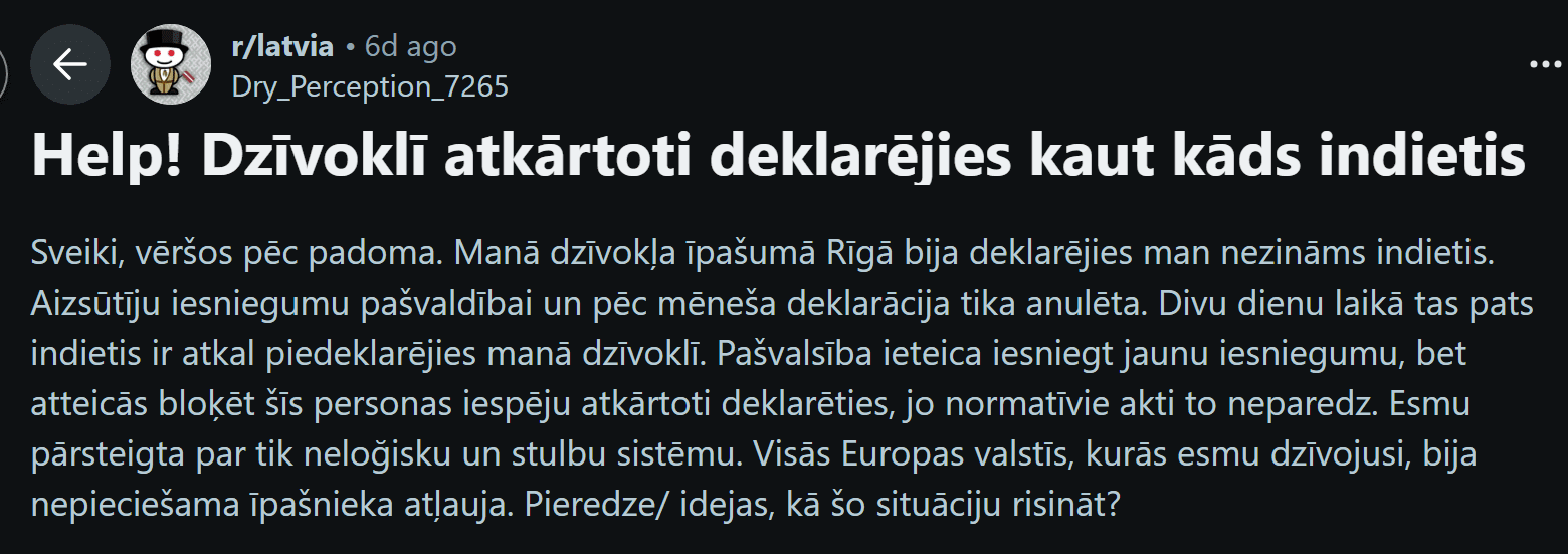 Год назад Сейм Латвии, реагируя на 10 тысяч подписей граждан Латвии, собранных на интернет-портале manabalss.lv, рассматривал этот вопрос. Подписанты требовали, чтобы лицо, желающее задекларироваться, в обязательном порядке получало разрешение хозяина на сайте latvija.gov.lv.