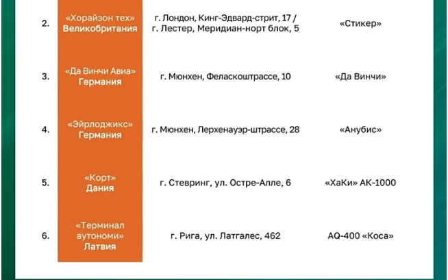 В опубликованном списке указано 11 филиалов, как утверждается, "украинских компаний, производящих дроны и комплектующие". Среди них - предприятия, якобы расположенные в британских Милденхолле, Лестере и Лондоне, датском Стевринге, немецком Мюнхене, латвийской Риге, литовском Вильнюсе, нидерландском Хенгело, польских Мелеце и Тарнуве, а также в чешской Праге.