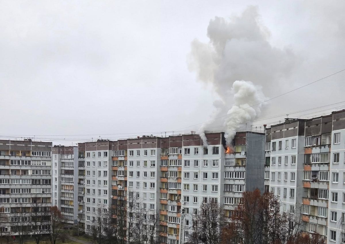 На фото видно, как из окон на последнем этаже валит густой дым, заметны и языки пламени.