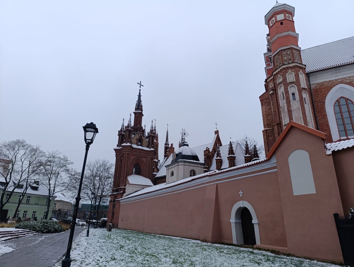 У кого есть время, можно подняться на смотровую площадку. Мы не стали. В один день всего не успеть - автобус обратно в 6 вечера. Решили пройтись по городу в сторону Ужуписа. И не пожалели. Как, например, пройти мимо старинного Бернардинского монастыря. Несмотря на воскресный день, храм оказался полон...верующими. Что интересно - преимущественно молодежь и люди среднего возраста. Атмосфера благостная, гимны красивые, орган, дисциплинированных иноверцев пускают без проблем.