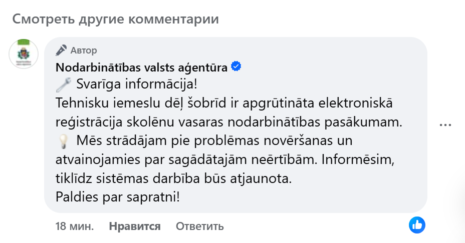 К слову, дети напуганы тем, что количество мест софинансируемых государством, ограничено. Все, кто сегодня пытался зарегистрироваться - перенервничали, что им работы теперь не хватит. Тем временем Директор программы NVA Павел Беликов утром 6 мая в эфире TV3 отметил, что школьники должны быть активными и сражаться за каждое место.