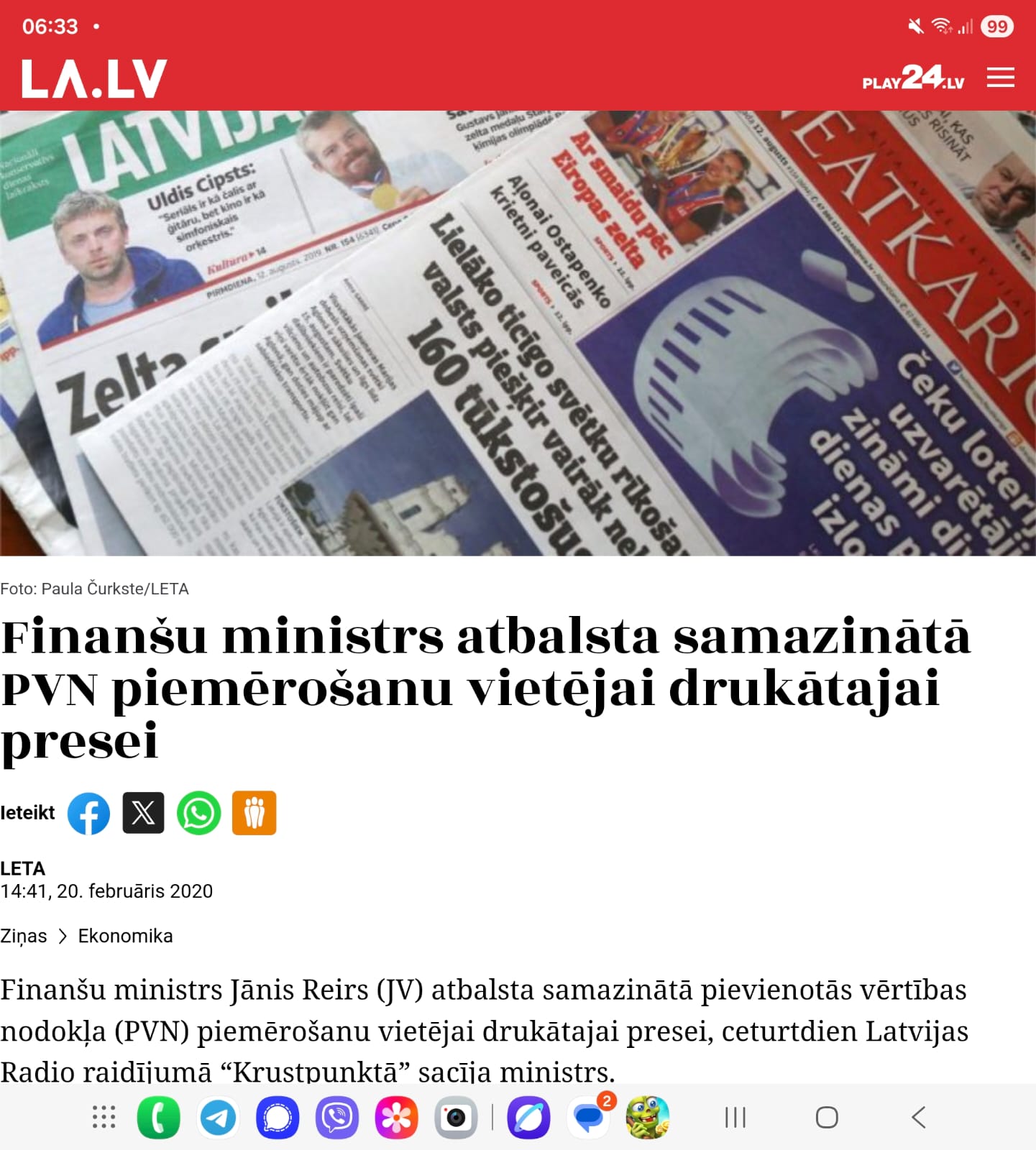Министр добавил, что в настоящее время сниженная ставка НДС в размере 12% применяется как к местной прессе, так и к печатным СМИ третьих стран. «Получается, что мы субсидируем негативный нарратив соседних стран по отношению к нам через сниженный НДС. Было бы правильнее применять к СМИ третьих стран полную ставку НДС в размере 21%», — признал министр финансов.