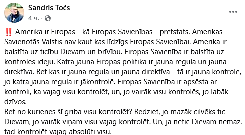 "Америка - противоположность Европы как Евросоюза. США - это не нечто подобное ЕС. Америка опирается на веру в Бога и на свободу. ЕС опирается на идею контроля. Каждая новая европейская политика - это новый регламент и новая директива. А что такое новый регламент и новая директива? Это новый контроль, потому что каждый новый регламент нужно проконтролировать. ЕС одержим контролем - нужно всё контролировать, и чем больше всё будет контролироваться, тем лучше будет жизнь.