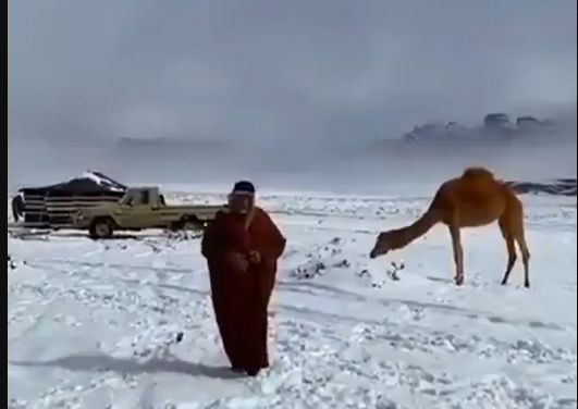 Север Саудовской Аравии засыпало снегом, а температура местами опустилась до –4°C. Верблюды идут по белым дюнам, люди танцуют в снегу, а интернет не верит глазам.