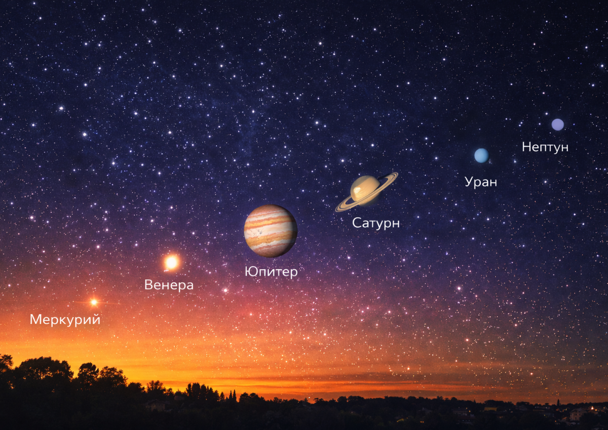 Хорошая новость для любителей астрономии — часть планет можно будет увидеть без телескопа. Венера, Юпитер и Сатурн будут заметны невооружённым глазом. Меркурий тоже можно попытаться разглядеть, хотя он часто прячется близко к линии горизонта. А вот Уран и Нептун уже потребуют бинокля или телескопа.