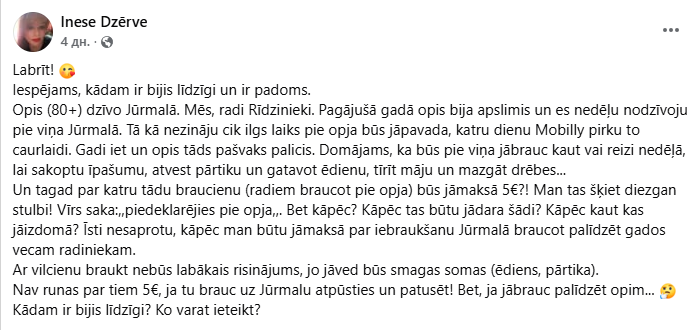 И теперь за каждую такую поездку (когда родственники едут к дедушке) придется платить 5 евро?! Мне это кажется довольно глупым! Муж говорит: «Зарегистрируйся у деда». Но почему? Почему нужно так поступать? Почему нужно что-то придумывать? Я действительно не понимаю, почему я должна платить за въезд в Юрмалу, когда еду помогать пожилому родственнику.