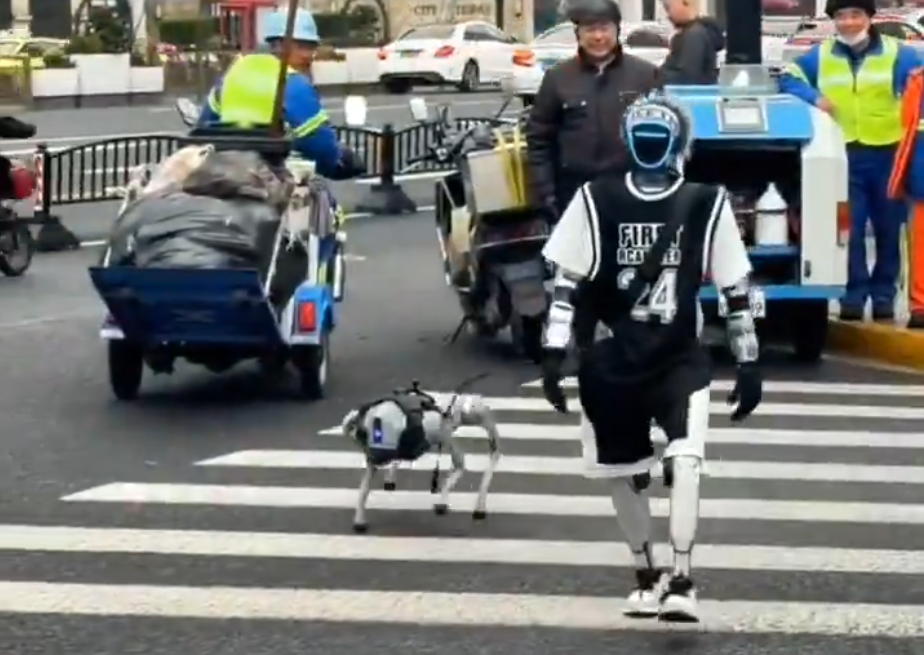 Видео быстро разошлось по соцсетям. На кадрах видно, как гуманоидный робот спокойно ведёт механического «пса» по обычной городской улице среди людей и машин.