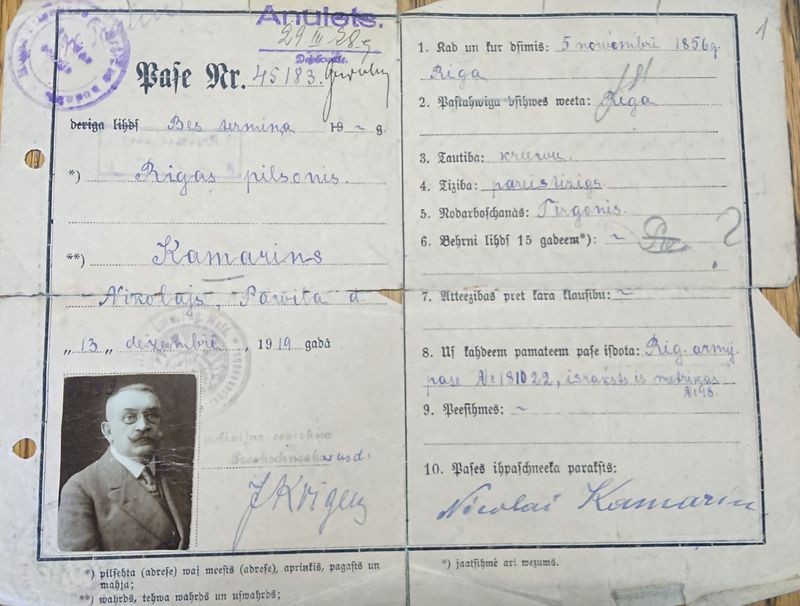 Латвийский паспорт, выданный Николаю КАМАРИНУ в декабре 1919-го.