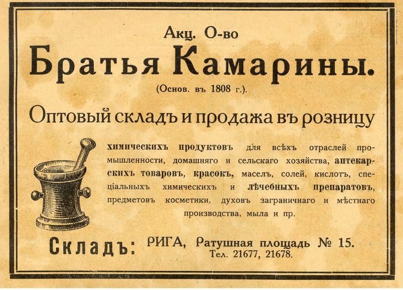 Чем торговали Камарины? В Рижской адресной книге за 1908 год сказано, что «это единственное место в Риге, где можно купить профессиональные и специфические лаки и краски». Управляющие заводами приходили сюда за химикатами, необходимыми для производства стекла, спичек, мыла. Экономки богатых рижских домов - за изысканным туалетным мылом, солью для ванн, моющими и дезинфицирующими средствами. Франты - за «колониальным товаром»: одеколонами, ароматическими маслами. Людям попроще тоже было что купить: там продавался недорогой табачок.