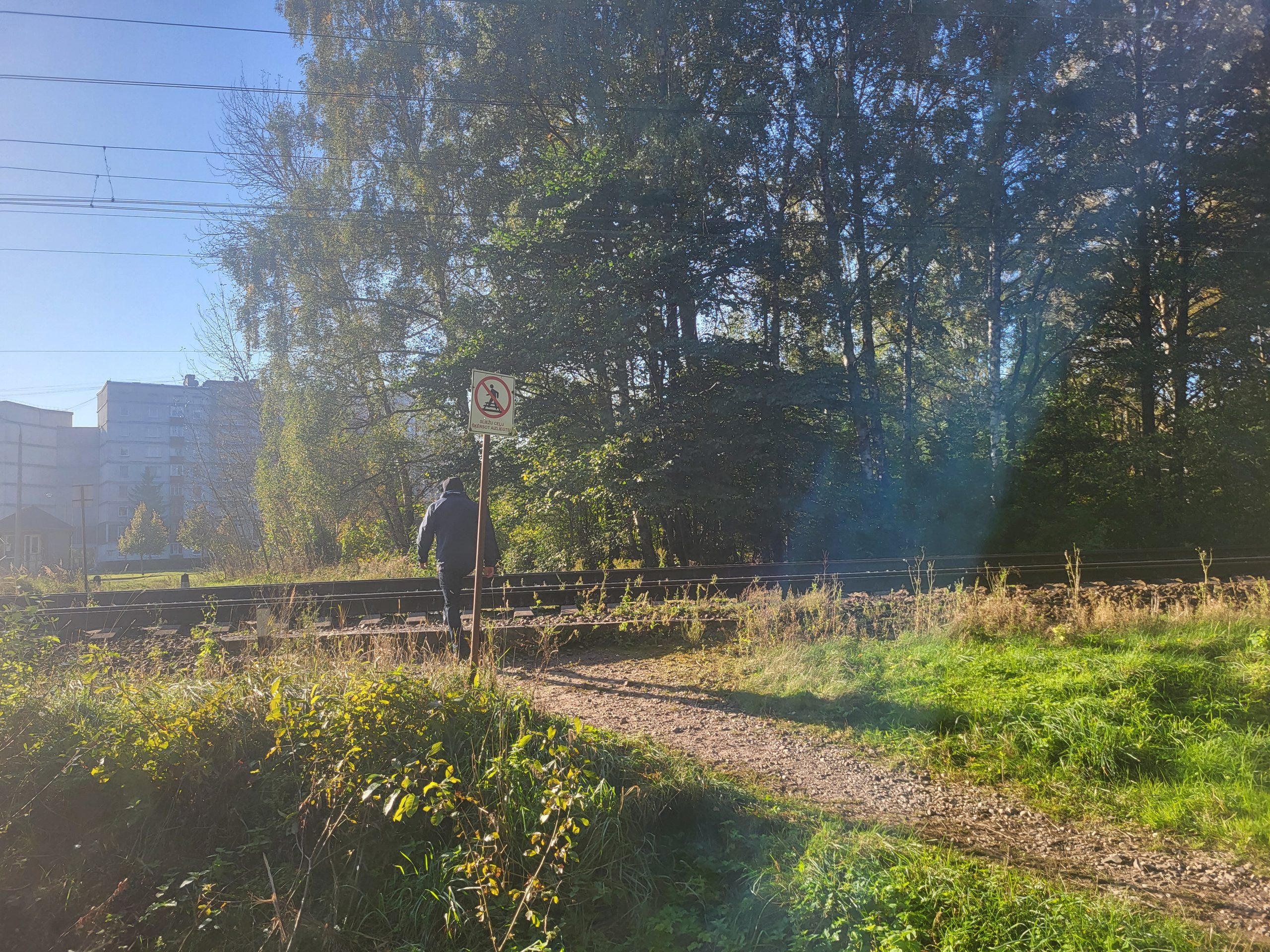 Пройдя дальше, через триста-четыреста метров мы видим еще одно место, где жители переходят железнодорожные пути. Но теперь уже "неофициальное". Несмотря на запрещающий знак, к нему не зарастает народная тропа. За 5 минут в этом месте перешли железную дорогу с десяток человек.