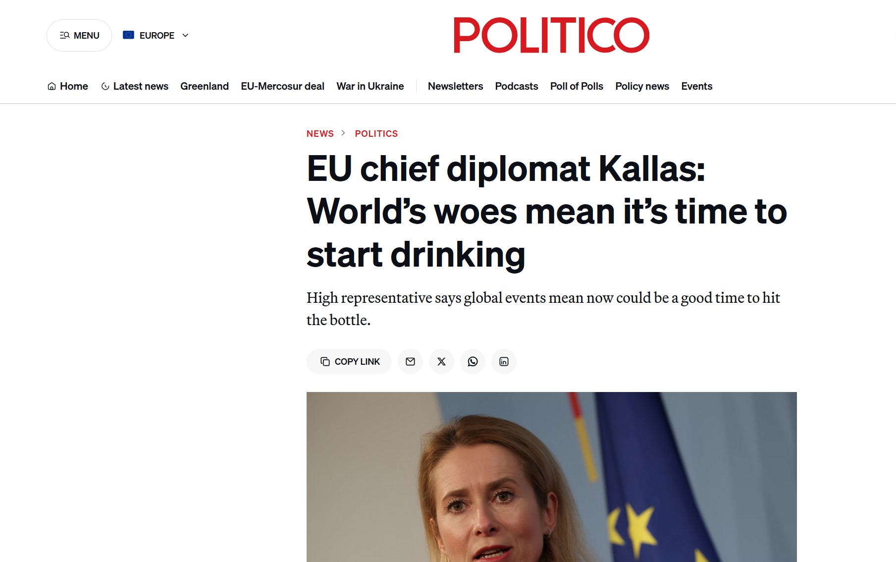 По словам двух человек, присутствовавших в комнате, Каллас сказала лидерам политических групп в Европейском парламенте, что, хотя она и не является большой любительницей алкоголя, сейчас, возможно, подходящий момент для того, чтобы начать пить, учитывая события, происходящие во всем мире.
