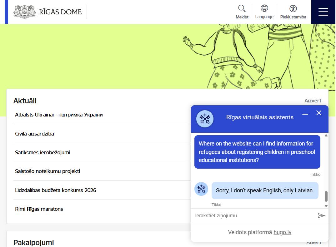 Виртуальный помощник, которого запустили на портале ещё в 2024 году, основан на платформе Hugo.lv, которой управляет Центр культурно-информационных систем.