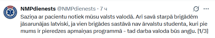 На это ей "неотложка отвечает: "Общение с пациентом происходит на нашем государственном языке. Бригады также должны общаться между собой на латышском языке, за исключением случаев, когда в состав бригады входят иностранные студенты, которые участвуют в нашей программе обмена опытом — в этом случае рабочим языком будет английский".