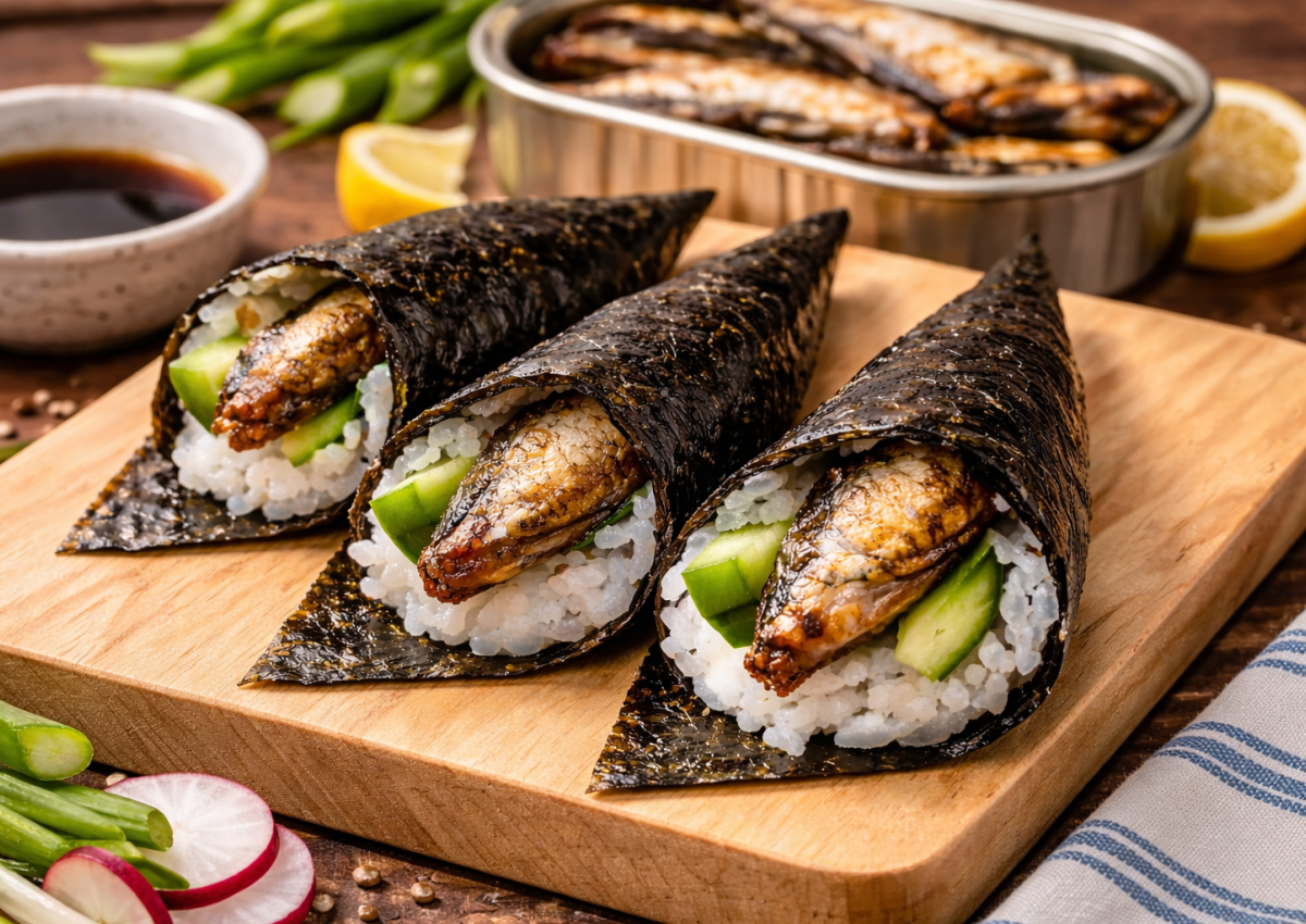 Суть блюда довольно простая: рис для суши, лист нори и рыба из банки — например сардины или скумбрия.