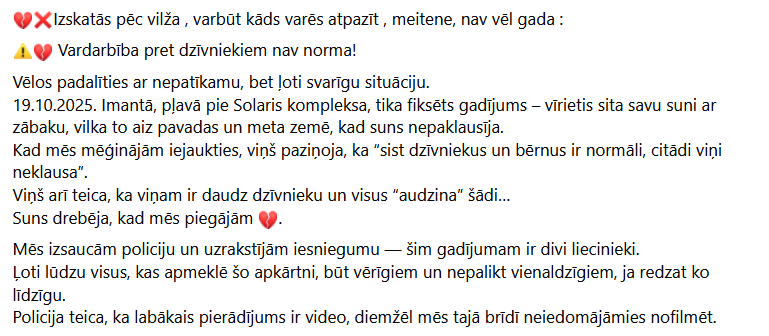 19.10.2025 в Иманте, на лугу возле комплекса Solaris, был зафиксирован случай - мужчина бил свою собаку сапогом, таскал за поводок и бросал на землю, когда собака не слушалась.
