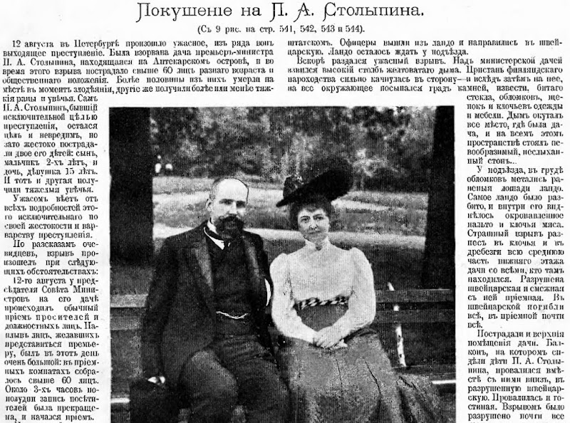 Ровно 110 лет назад, 25 августа 1906 года (по новому стилю) произошел один из самых кровавых терактов в истории царской России. Трое террористов-смертников, членов партии эсеров взорвали три бомбы в особняке премьер-министра Столыпина на Аптекарском острове Санкт-Петербурга. Главной целью теракта, разумеется, был сам премьер, но он не пострадал, зато погибли 30 человек, не считая самих террористов. Еще 33 человека получили тяжелые ранения, в том числе трехлетний сын Столыпина и его 15-летняя дочь, которая едва не лишилась обеих ног.