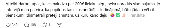 «Когда я искал работу, зарплата предлагалась на 300 евро меньше, чем мы в итоге договорились до заключения трудового договора; работодатели бывают разные. Более того, они сами заранее спросили меня, за какие деньги я готов работать…», - рассказал Карлис.