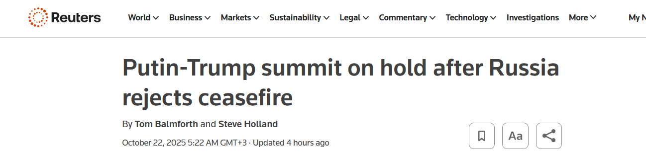 Источники Reuters говорят, что переговоры сорвались, когда стало ясно: Москва не готова идти на уступки. Путин, по их словам, продолжает настаивать на «радикальных требованиях», включая контроль над всей территорией Донецкой области и отказ Украины от вступления в НАТО.