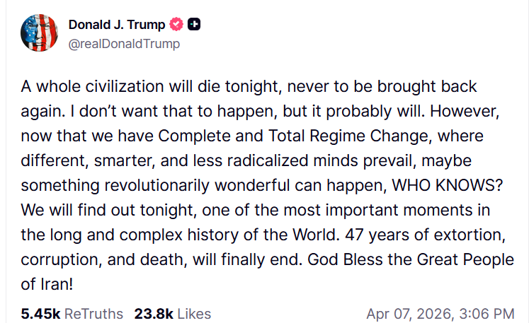 «Сегодня ночью погибнет целая цивилизация, чтобы уже никогда не возродиться. Я не хочу, чтобы это случилось, но это, вероятно, произойдет. Однако, теперь, когда у нас произошла полная и тотальная смена режима, когда стали преобладать другие, более умные и менее радикальные люди, возможно, произойдет что-то неожиданно прекрасное, КТО ЗНАЕТ?» — написал Трамп в соцсети Truth Social.