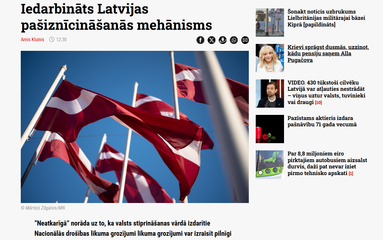 "Сразу после вступления закона в силу агентство LETA опубликовало целую серию таких новостей: «SIA "Daugavpils reģionālā slimnīca" в последний рабочий день января уволила почти 50 сотрудников — граждан России и Белоруссии»; «Клиническая университетская больница имени Паула Страдиня прекратила трудовые отношения с десятью гражданами России и Белоруссии, поскольку этого требует Закон о национальной безопасности»; «Восточная больница прекратила трудовые отношения с 13 гражданами России и Белоруссии…».