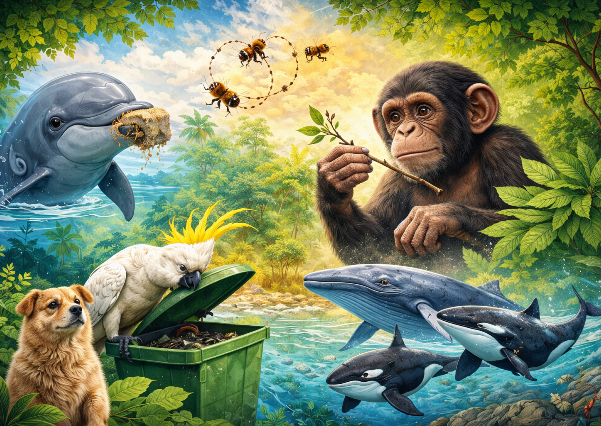 У животного мира таких примеров хватает. Пчёлы передают информацию о еде с помощью особого танца. Австралийские какаду научились открывать крышки мусорных контейнеров и активно обучают этому сородичей. Дельфины используют губки как инструменты для охоты, а кашалоты общаются с помощью собственных «кодов» из щелчков, по которым формируются группы.
