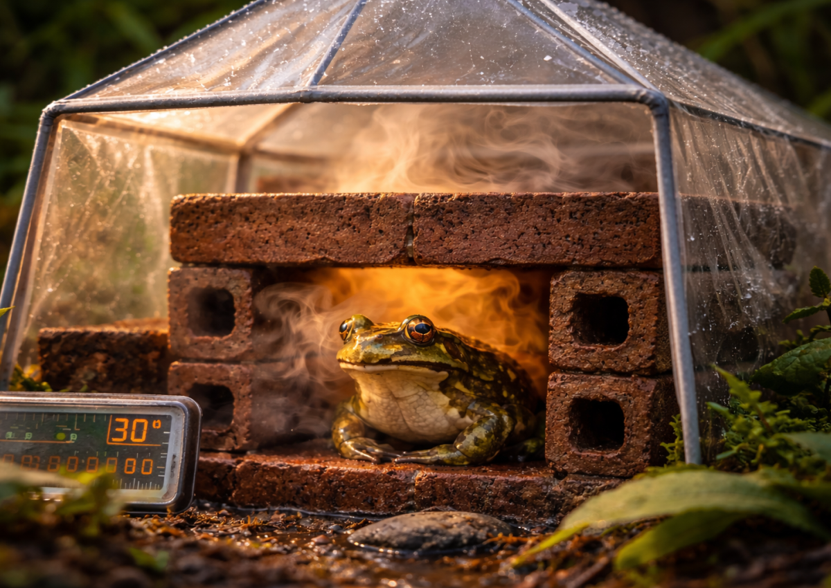 Идея оказалась неожиданно простой. В лаборатории в Австралии он начал строить для лягушек небольшие «сауны» из кирпичей, накрытые мини-теплицами. Внутри температура была выше, чем снаружи — и этого оказалось достаточно.