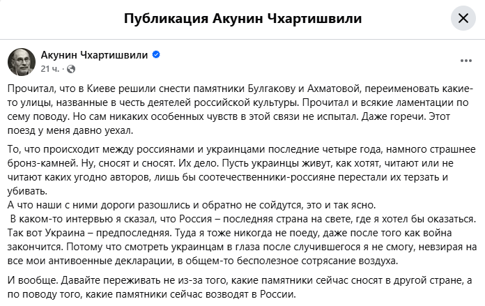 -Прочитал, что в Киеве решили снести памятники Булгакову и Ахматовой, переименовать какие-то улицы, названные в честь деятелей российской культуры.