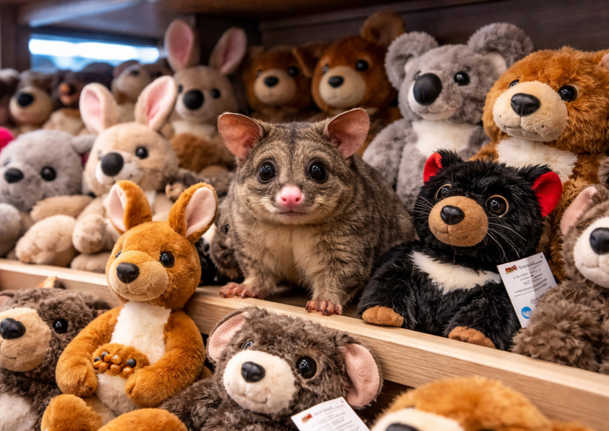 18 марта в подарочном магазине аэропорта в Тасмании произошла сцена, которую сложно придумать даже для рекламы. Настоящий австралийский поссум пробрался внутрь и уютно устроился прямо на полке — среди плюшевых кенгуру, билби, динго и тасманийских дьяволов.