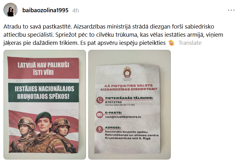 (Надпись на листовке: «В Латвии не осталось настоящи мужчин. Вступай в Национальные вооруженные силы»).