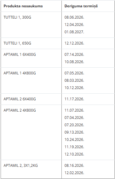 Распространитель продуктов «Aptamil» и «Tutteli» в Латвии — компания «Nutricia» — сообщила Продовольственной и ветеринарной службе, что, хотя в распространяемой ею продукции новые допустимые нормы цереулида не превышены, в целях предосторожности она отзывает с рынка партии продукции, в которых показатель токсина относительно близок к новой допустимой норме.
