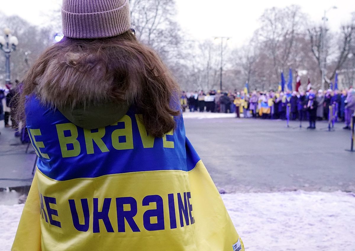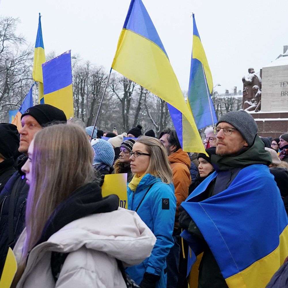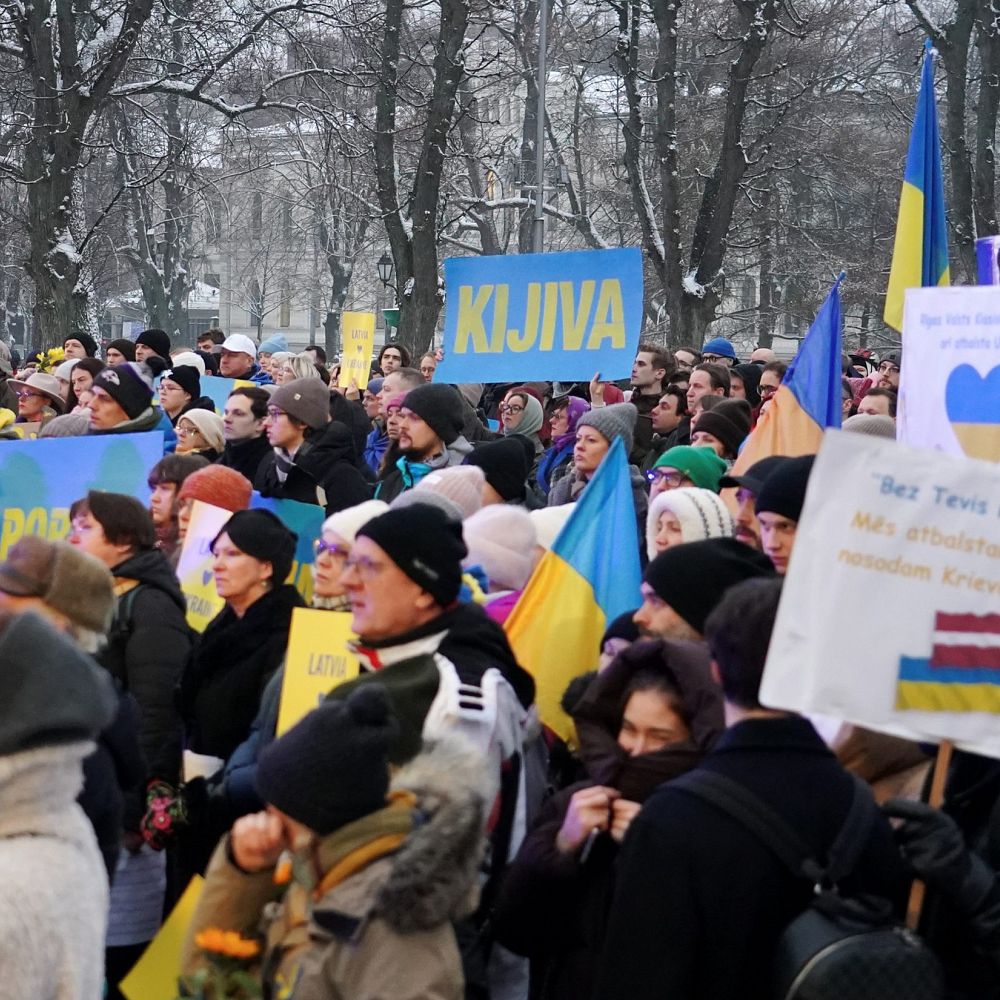 Во вторник, в день четвертой годовщины войны в Украине, примерно 500 человек собрались в Риге у памятника Свободы в рамках акции "Вместе до победы!".