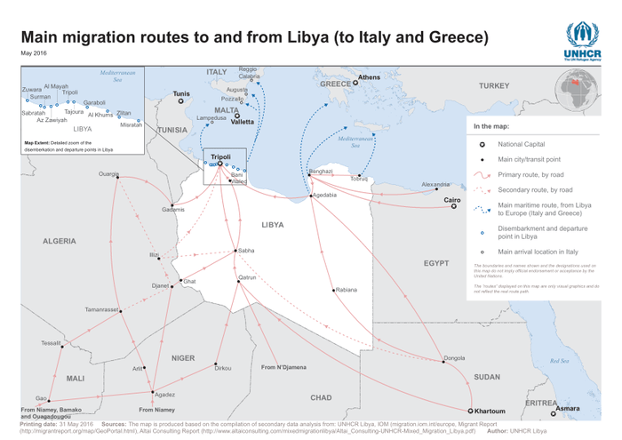 Уже к 2014 году ливийское побережье стало главным маршрутом нелегальной миграции в Европу. Только с 2014 по 2016 годы через Ливию и центральное Средиземноморье в Италию прибыло более миллиона человек.