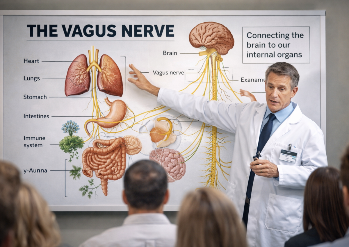 «Сколько у вас времени?» — так отвечает профессор Оуэн Эпштейн, когда его спрашивают, что делает этот нерв. Он связывает мозг с кишечником, сердцем, лёгкими, иммунной системой. Именно через него тело «сообщает» нам: голодны ли мы, тревожны ли, устали ли.