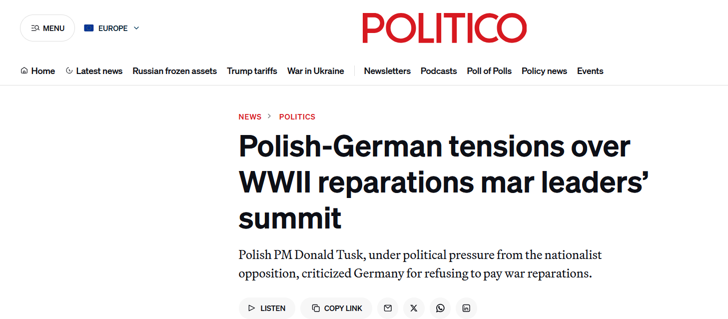 Однако Туск, под давлением оппозиционной националистической партии «Право и справедливость» (PiS), занял по этому вопросу более жесткую позицию, чем в прошлом, критикуя логику Германии, отказывающейся выплачивать Польше военные репарации.