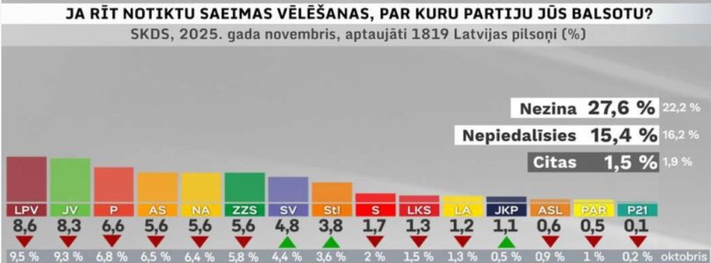 В Латвии выборы определят, кто станет преемником нынешней правоцентристской коалиции во главе с премьер-министром Эвикой Силиней. В настоящее время ее партия занимает второе место в опросах, уступая лишь консервативному Национальному объединению. (Так в тексте Евроньюз, на самом деле Нацобъединение на пятом месте, а на первом "Латвия на первом месте" - европейцы перепутали, бывает).