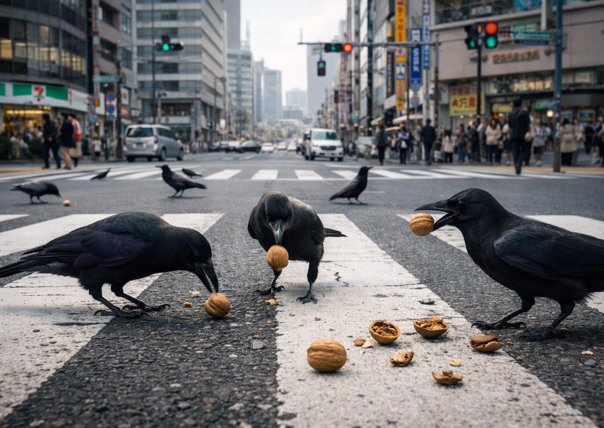 Такое поведение наблюдали в Токио, Сендае и других городах. Вороны явно понимают: пока едут машины — опасно, когда движение остановилось — можно идти. Они не «читают правила», но отлично улавливают ритм города.