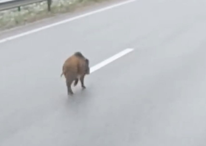 В социальной сети Facebook в группе Sadursme.lv опубликовано видео, как по скоростному шоссе из Риги в Юрмалу неспешно бредет лесной кабанчик. Некая женщина не осталась равнодушна - отважная дама попыталась согнать животное с дороги.