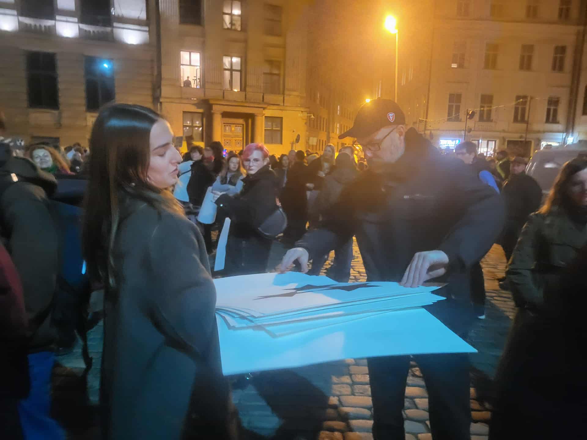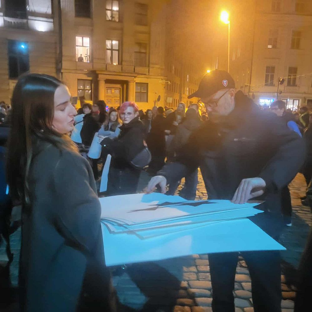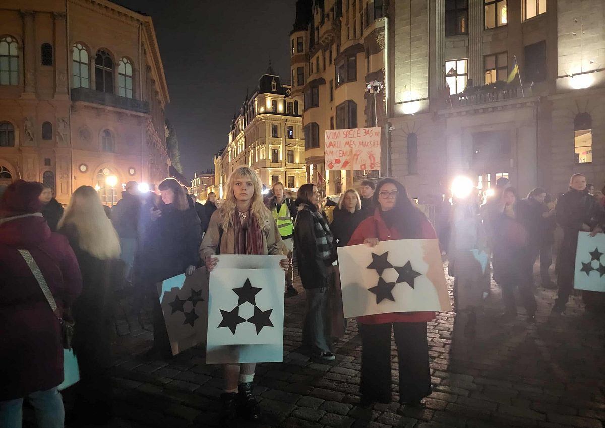 press.lvВ толпе слышится как латышская, так и русская речь. К 19.00 площадь начинает заполняться людьми. Тем, кто пришел заранее, организаторы массово раздают плакаты с тремя черными звездами, нарисованными под трафарет. Эти плакаты изготовили накануне в большом количестве. Правда в чем их символическое значение, большинство участников протеста не знают. - Это как звезды на Милде, - отвечает активистка, предлагающая взять плакатит. - Почему черные, это я не готова комментировать. А так, по моим ощущениям, это означает что мы поддерживаем не Сейм, а Латвию.