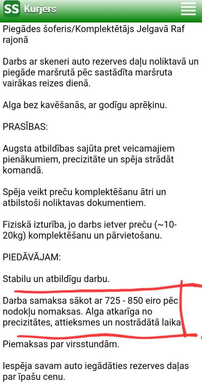 В объявлении указано, что в Елгаве ищут курьера/комплектовщика. Обещается, что заработная плата будет выплачиваться без задержек, при этом оплата труда составляет от 725 до 850 евро. Также отмечается, что размер вознаграждения зависит от отношения к работе, отработанного времени и точности. Упоминается и возможность получения доплат за сверхурочные часы.